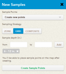 | You have several options for creating a new Sample Point set. In our case, we will create new points, on a grid, with a six to 12 inch sample depth. | ![]() |